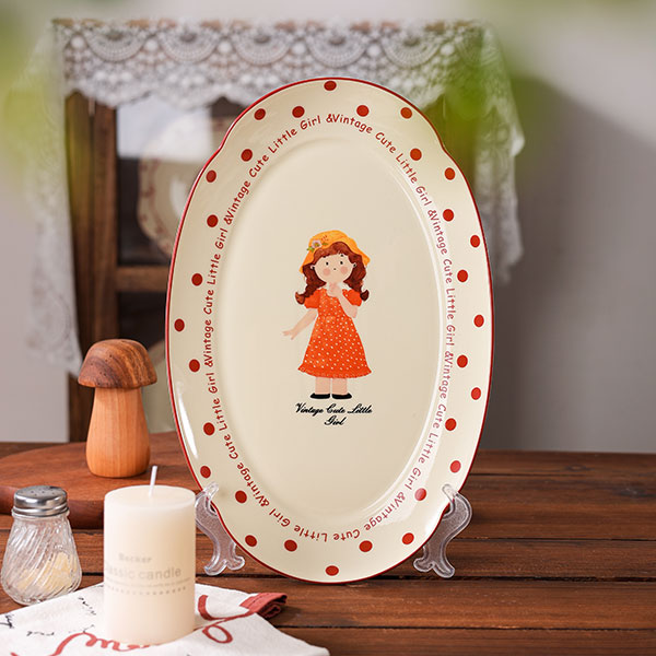 Длинная овальная тарелка с изображением девушки в шляпе подходит для русских рыбных блюд. Красная кайма и точечный узор придают тарелке торжественный вид! Керамика устойчива к перепадам температур, после приготовления рыбы на пару глазурь остается гладкой, не прилипает и не трескается. Тарелка удобна для сервировки и украшает стол, позволяя русским блюдам из морепродуктов выиграть в деталях уже на этапе сервировки.