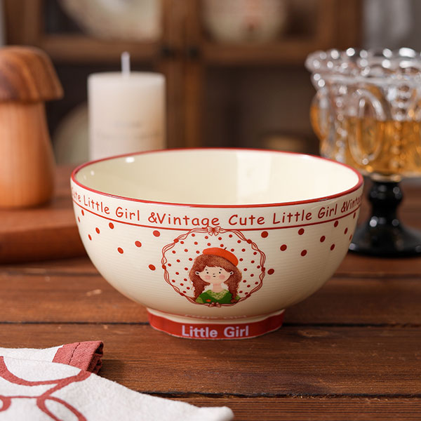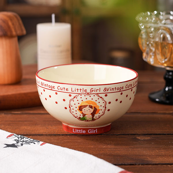 Милые горошки в сочетании с ретро-рисунком девочки, молочно-белый фон + красная кайма, очень красиво! Керамика плотная, горячий суп и каша не обжигают руки, подходит для повседневных русских обедов.