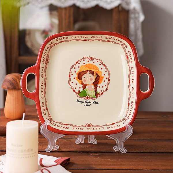 Квадратная тарелка с двумя ручками, украшенная иллюстрацией девушки в ретро-стиле, подходит для русских жареных блюд и рагу. Красная кайма подчеркивает изысканность, керамика прочная, не деформируется при подаче горячих блюд. Используется для семейных обедов, практична и украшает стол, придавая русским блюдам ретро-атмосферу, это «тарелка для основных блюд»!