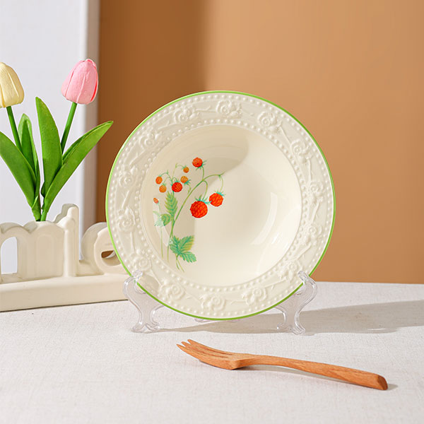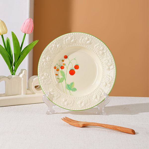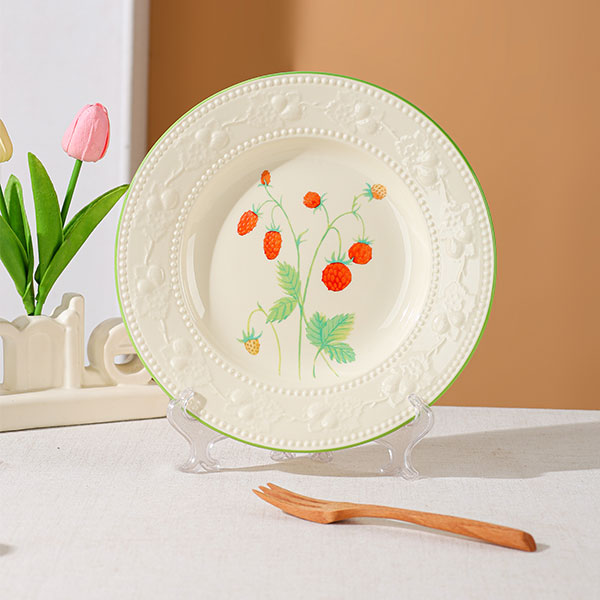 Потрясающая тарелка с тиснением «Клубника» уже здесь! Кремово-белое основание и зелёный ободок, центральная часть расписана вручную клубничными лозами, а тиснёный узор обрамляет края, создавая изящное произведение искусства.