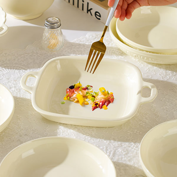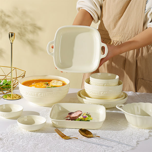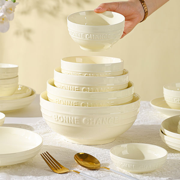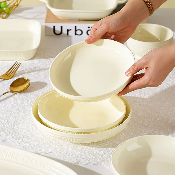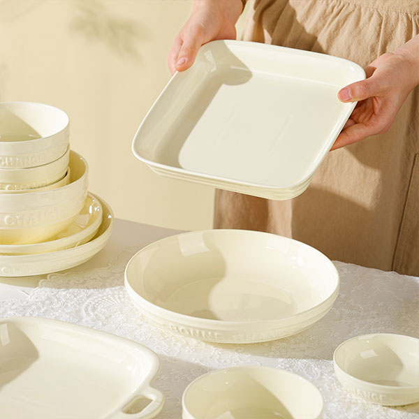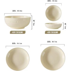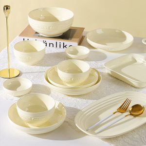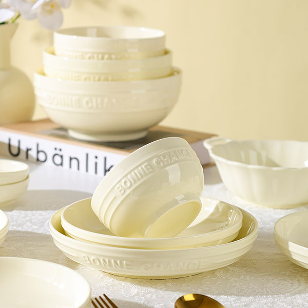 Для русских друзей набор посуды «удача» уже здесь! Его кремово-белый оттенок с тисненой надписью сочетает французскую романтику с практичностью, идеально подходя для русских банкетов. От борща и жареного мяса до изысканных десертов – этот набор мгновенно поднимет вашу трапезу на изысканный и торжественный уровень.